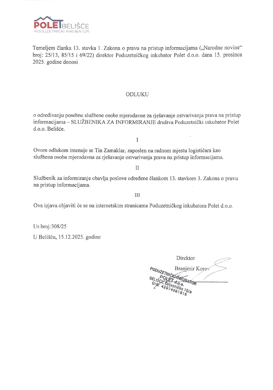 ODLUKA – o određivanju službenika za informiranje PI Polet